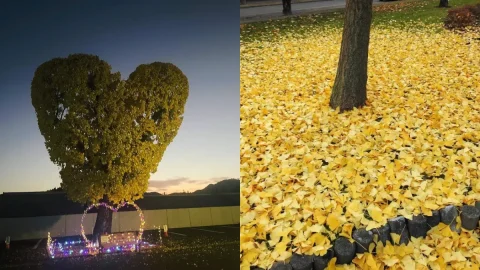 ต้นแปะก๊วยทรงหัวใจ ในจังหวัดนางาซากิ ถูกประดับไฟเพื่อส่งท้ายปี